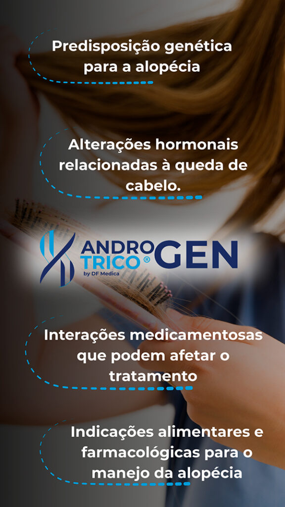 O Androgen é um exame genético preditivo voltado para o tratamento da alopécia, condição caracterizada pela queda excessiva de cabelo. Ele permite a identificação de fatores genéticos que influenciam o desenvolvimento da doença, ajudando na personalização do tratamento, incluindo ajustes na alimentação e escolha de terapias adequadas.